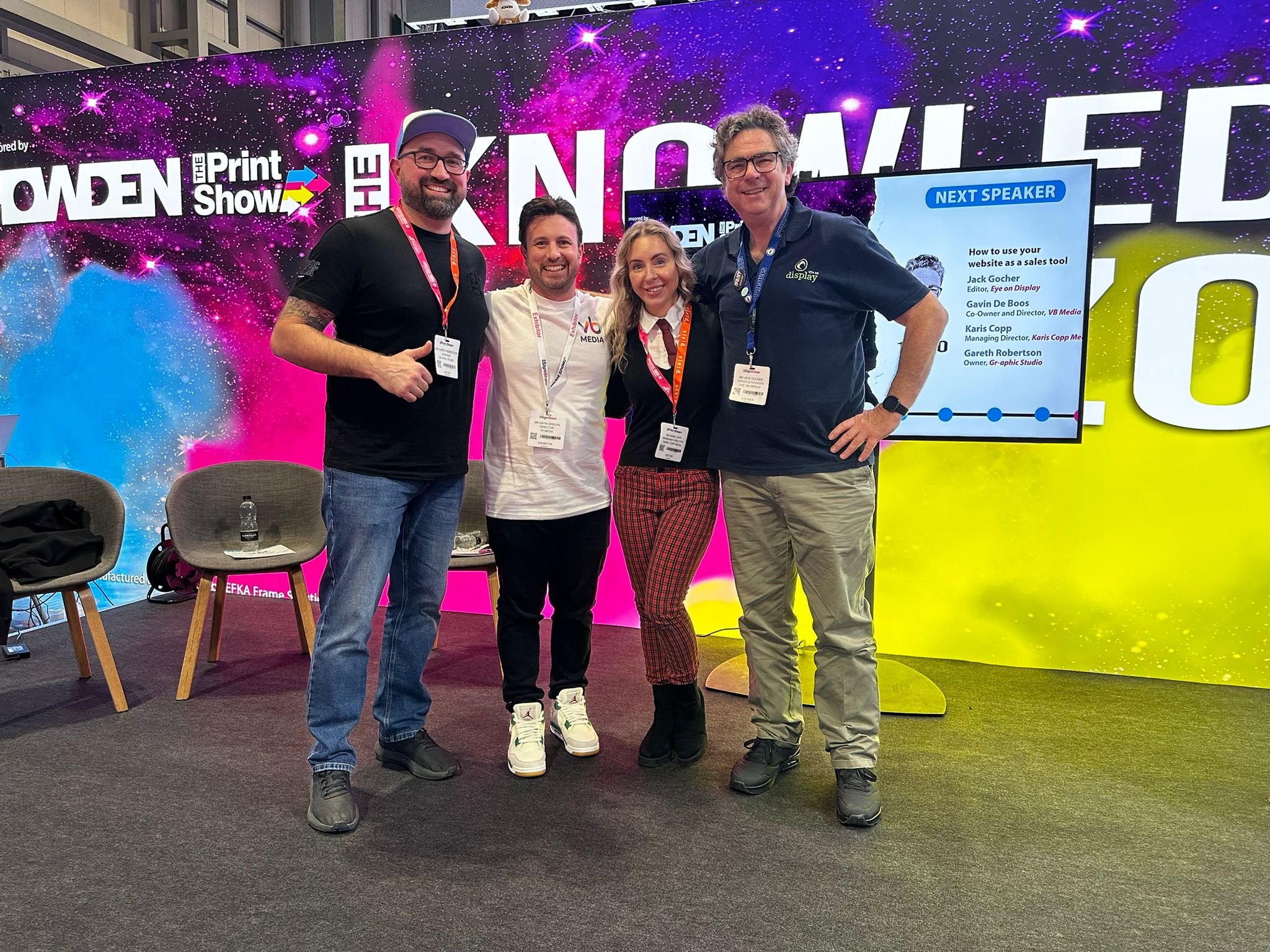 KC Media supported VB Media in hosting a panel discussion at The Print Show 2026. [L to R] Gareth Robertson, Owner of Gr-aphic Studios; Gavin DeBoos, Co-Founder and Director, VB Media; Karis Copp, MD, KC Media; Jack Gocher, Editor, Eye on Display